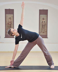 Die gestreckten Beine gut 120 cm grätschen, die Arme seitlich ausstrecken. Aus der Hüfte heraus nach rechts beugen, bis der Oberkörper annähernd parallel zum Boden ist. Die Handflächen nach vorne drehen, die linke Hand zeigt senkrecht nach oben, die rechten Fingerspitzen zeigen zum oder berühren sogar den Boden. Eine Minute halten, auf der anderen Seite wiederholen.