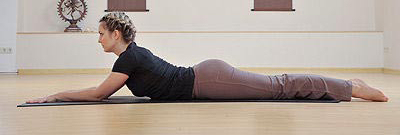 Auf den Bauch legen, die Ellenbogen sind unter den Schultern, die Unterarme liegen auf dem Boden auf. Die Beine sind gestreckt, die Zehen sind nach hinten gerichtet. Jetzt den Oberkörper bis zum Beginn des Rippenbogens vom Boden abheben. Der Blick bleibt dabei nach vorne gerichtet, der Nacken entspannt. Eine Minute halten.